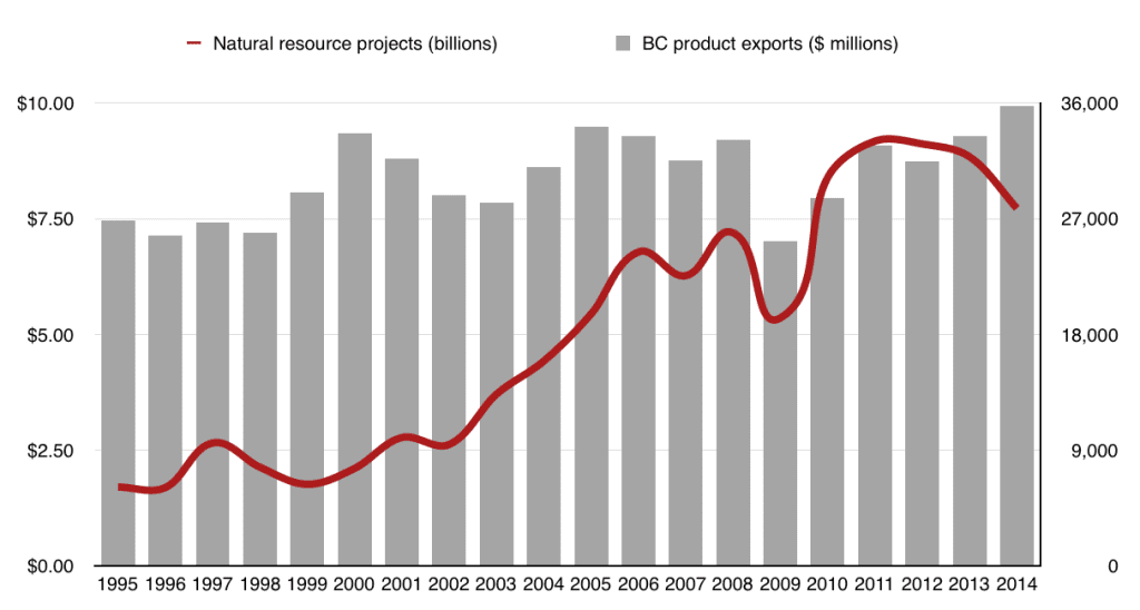 Natural resources – forestry, mining, natural gas – are consistently the second-largest source of capital investment. Nearly $8 billion was budgeted for infrastructure and equipment for the British Columbia resource industry in 2014, the most recent year for which we presently have data. (The source of this data can be found on page 74 here and in previous years’ editions.)