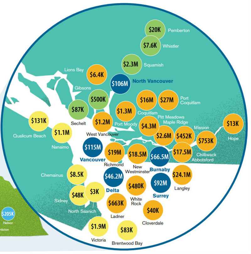 Full text: Since 2009, Coal Alliance marine terminals have spent more than $584.4 million purchasing goods and services in communities across B.C. This map shows where the investments were made. The whole industry generates over $3.2 billion in economic activity in B.C. each year. (Read the announcement)