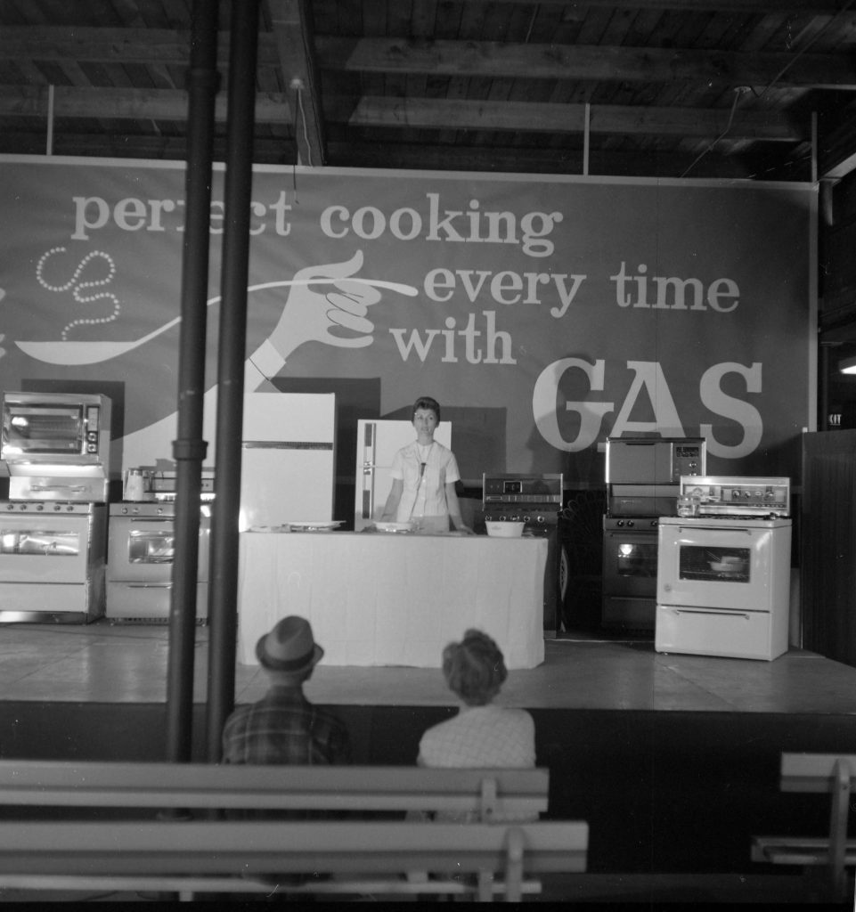 In 1967, the PNE gas exhibit emphasizes cooking. Whatever the other 25,999 uses are, this stage display gives no clue.