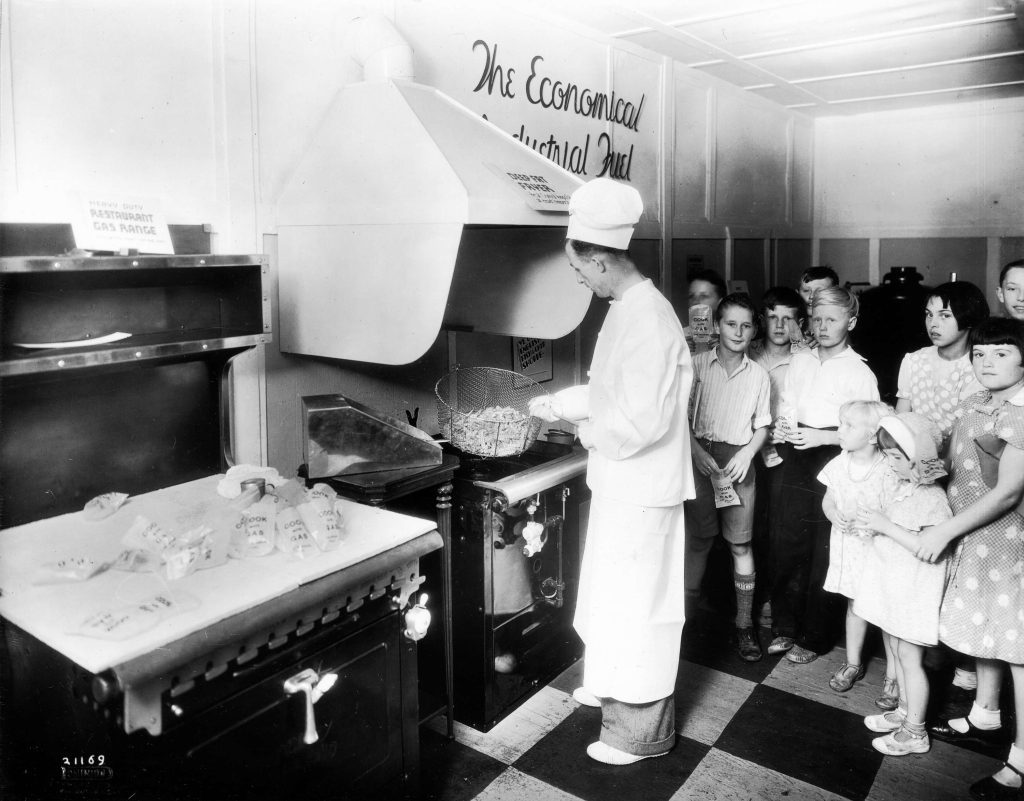 By 1935 it was the depths of the Great Depression. The gas company’s PR men must have known there were hungry children about because for that year’s publicity campaign they decided giving french fries to kids was the way to build interest. And sure enough, look at those waifs clutching their chip baggies waiting for delicious hot gas-cooked fries to be dished up.