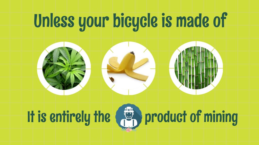 Bicycles, unless you ride one you made yourself from bamboo, lashings of hemp and dried banana peels, are entirely manufactured from materials obtained by mining — steel processed by burning metallurgical coal, perhaps lightened by adding specialized metals like titanium; plastic and synthetic rubber obtained from petroleum products.