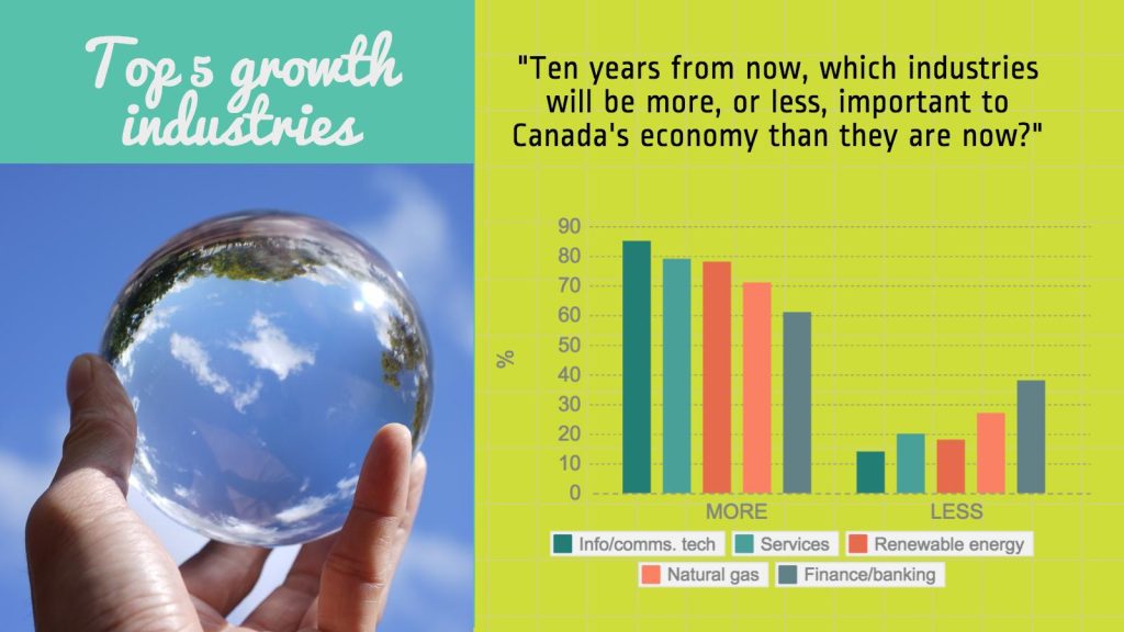 The survey also found that renewable energy, natural gas and the service sectors will be more important than other areas to Canada’s economy in a decade.