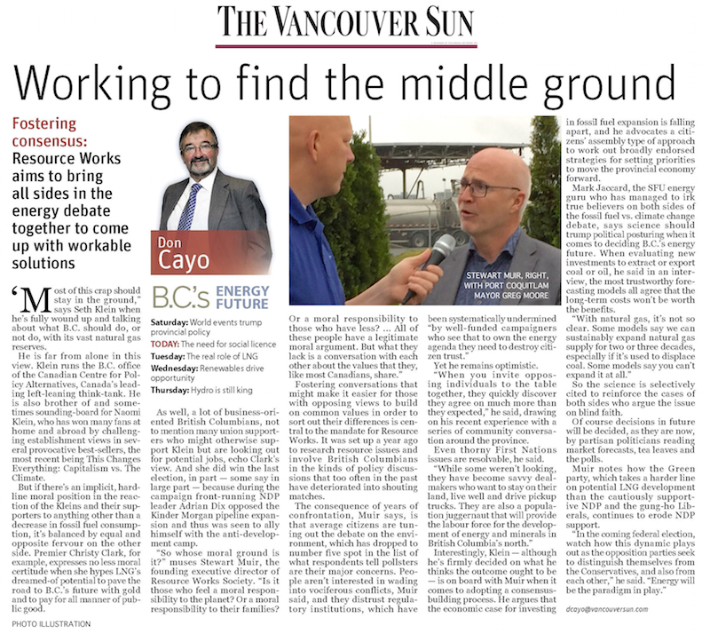 As Muir told Vancouver Sun columnist Don Cayo in a recent series about BC’s energy future: “When you invite opposing individuals to the table together, they quickly discover they agree on much more than they expected.” Cayo also interviewed a climate-change activist. The contrast is instructive.
