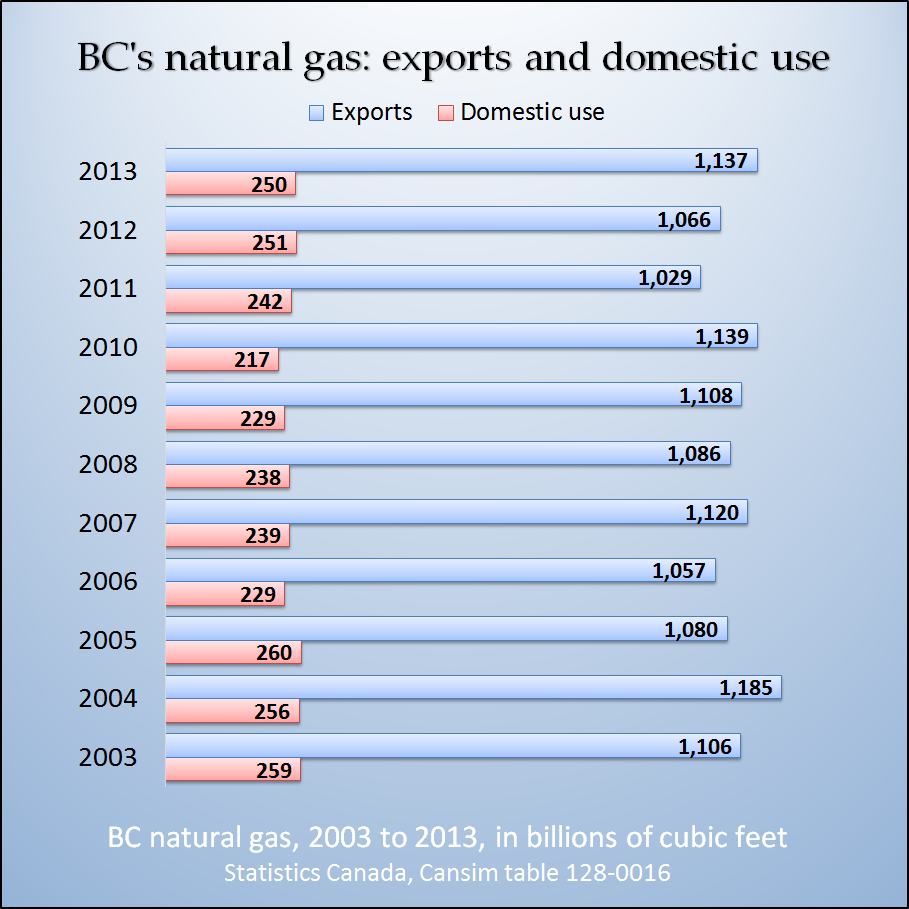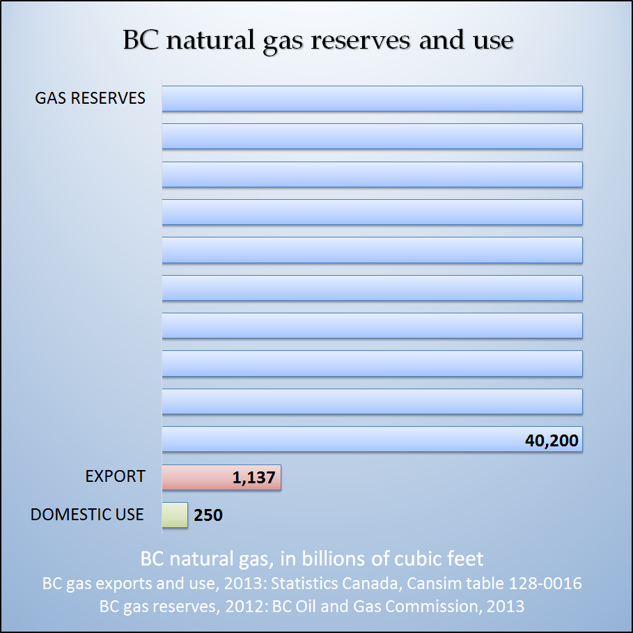 As you can see here, BC’s total natural gas reserves far exceed the amount of gas exported and the amount of gas used in a single year. You’ll notice that in the chart above, I had to cut BC’s gas reserves into 10 chunks. If I hadn’t, the bar describing BC’s domestic use wouldn’t even be visible. It works out that BC has enough gas to supply us for 160 years at our 2013 consumption level.