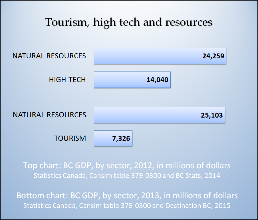 As you can see, both high tech and tourism are big, important parts of the BC economy, responsible for billions of dollars of economic activity. But no, they are not bigger than the resource sector in terms of GDP, even combined.