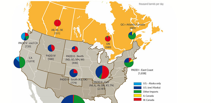 This infographic shows U.S. and Canadian refinery demand according to where the oil comes from. The red is western Canadian oil, and yellow is from eastern Canada. Quebec gets its oil from overseas (mostly Algeria at the moment), which may help to explain why there is a major move afoot to ship Alberta oil eastward.
