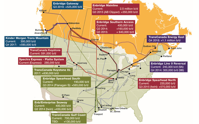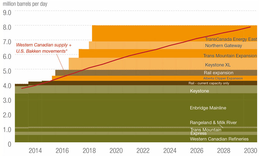 We are hearing a lot about the growth of rail as a way for Canadian oil to get to market while new pipelines get built. According to this infographic, rail is definitely on the upswing. But it is no panacea. Future pipelines shown here dwarf the impact of rail. What’s also interesting is that the new Energy East pipeline to Saint John, New Brunswick is as big as the combined size of the Northern Gateway and Kinder Morgan proposals for the west coast of Canada. There is an old rule in the petroleum industry dating back to the beginning of the modern oil industry and it is that oil will always get to market. The red line is the amount of oil being produced in western Canada and the big new United States source from the Bakken shale that we commonly associate with North Dakota. These pipeline projects have a huge economic footprint. When IHS/CERA studied just the Kinder Morgan, Northern Gateway and Keystone XL pipeline projects, it was found that they would unlock more than $1.3 trillion in economic output for Canada and $281 billion in tax revenue over a 25-year period.