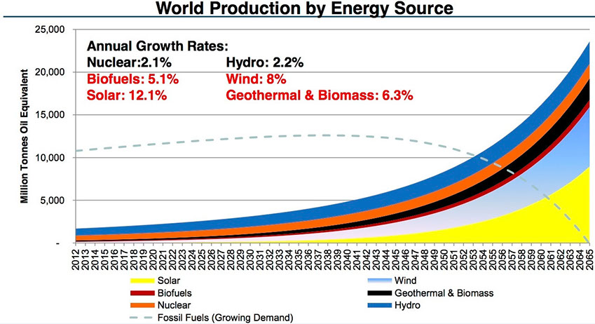 Here is one scenario showing what has to happen for current usage of fossil fuels to be replaced by alternative energy sources. Solar has to grow by 12 per cent a year and wind by 8 per cent. We will also need much more geothermal and biomass, as well as a healthy dose of nuclear and hydro. Alternatively, we could try to do without power altogether – not a situation that anyone is likely to be contemplating. According to one source, we may be on track with solar, which increased 35 per cent globally in 2013. Wind has also had a good run recently with annual growth rates of 16 per cent. Assuming that over the longer term growth rates would be lower overall, this infographic (source: BP) suggests it will take until well into the 2050s for non-fossil-fuel energy to be the majority.