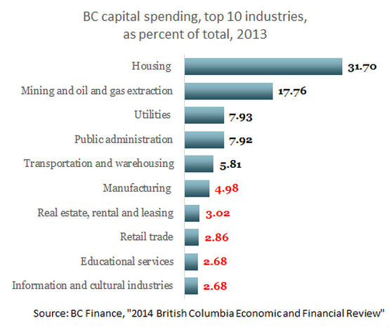 BC actually suffered negative employment growth in 2013, according to these figures, losing about 5,000 jobs. That’s a contraction of 0.2 percent. In contrast, employment in the mining and oil and gas industries grew a robust 15.4 percent, faster than any other major category except for local administration and insurance.