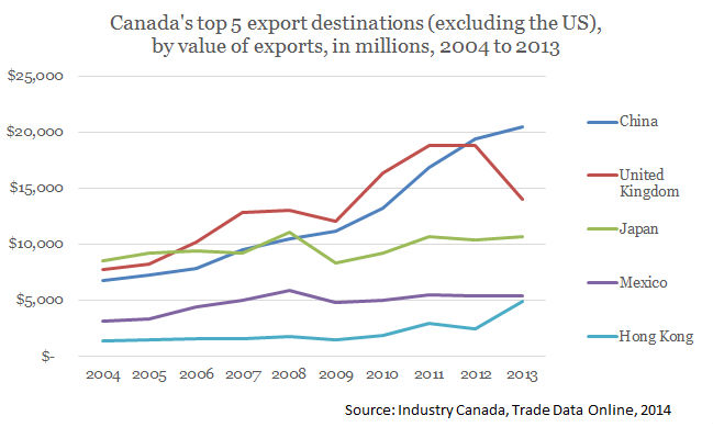 Let’s start with the reality before we move on to opinion. Canada’s trade with Asia has ramped up significantly in the last 10 years. Here’s a look at Canada’s top five export destinations, not including the US. (The US still dwarfs all other countries, accounting for 76 percent of all Canadian exports). Note that three of these top five countries are in Asia, and our exports to them are all increasing.