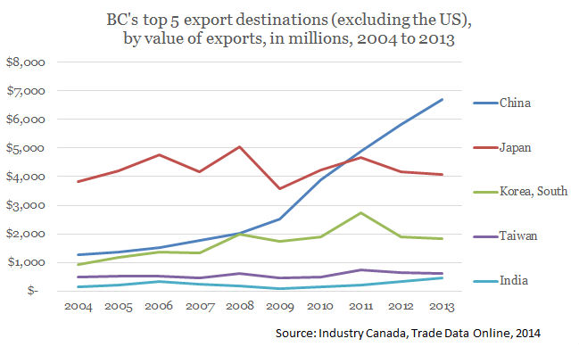 If we look at the same numbers for BC, we get an even more dramatic story. All of our top five export destinations (excluding the US, which is still number one by a long shot) are Asian countries. The spectacular growth in trade with China means that this country now buys 20 percent of all BC’s merchandise exports.