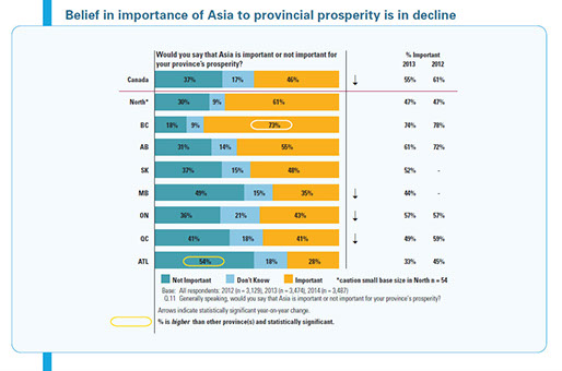 Despite this reality, it seems that Canadians are becoming less and less interested in increasing economic ties with Asia. Here are a few excerpts from the Asia Pacific Foundation survey.