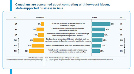 The survey shows that Canadians are concerned about competing against cheap Asian labour and against companies that rely on state support. Canadians still support trade and investment missions to Asia, although less so than before, and not if it includes incentives to Canadian businesses. Meanwhile, Asian investments in Canada are viewed with suspicion, with an even split between Canadians who think they’d benefit from them and those who don’t.