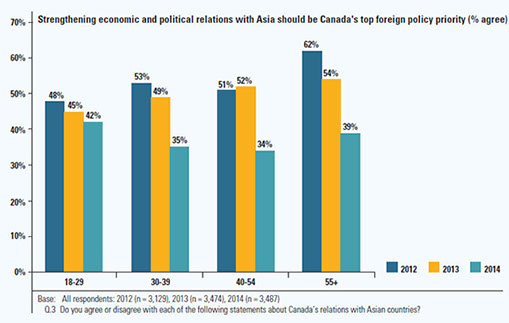 An important finding from the survey is that not all Canadians are becoming less enthused about trade with Asia. It turns out that most of the declining attitudes are due to changing opinions among older Canadians. Attitudes of younger Canadians were relatively stable compared to past years’ surveys.
