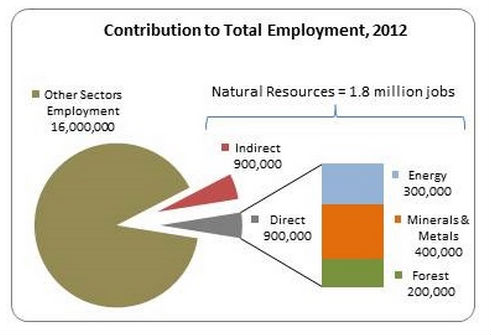 About five percent of working Canadians are employed directly in natural-resource industries (900,000), and another five percent work in jobs that support the resource sector (another 900,000). Added together, this is about 10 percent of the roughly 18 million Canadians in the workforce.