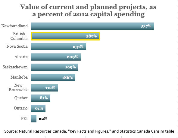 You can see just how significant these trends are when you look at the size of ongoing and planned major projects in the BC resource sector. When taking into account normal amounts of capital spending in each province, BC has the second-highest level of incoming projects in the country, after Newfoundland. (To put these big numbers in perspective, I’m showing them as a percentage of the total spending on things like machinery, equipment and buildings in each province in 2012).