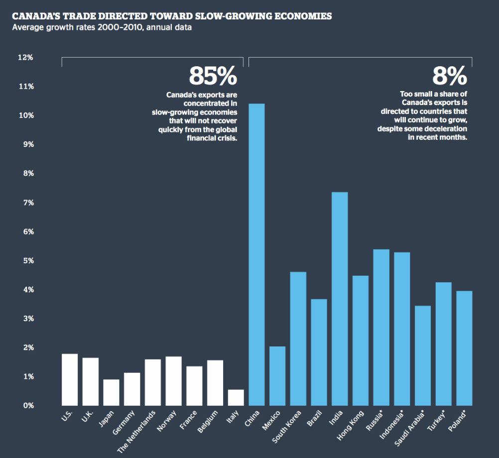 Canada should mount a sustained effort to diversify its trade and investment, building on its success in the U.s. market to become a more global trader. This means addressing not just trade policy but also policies that have an impact on the size and competitiveness of Canadian firms. In the absence of progress in the multilateral trade talks through the World Trade Organization, Canada should focus on negotiations involving the largest possible number of countries, such as the Trans-Pacific Partnership, and look beyond China so we do not repeat the error of putting all our eggs in one basket. Government can help companies plug into global value chains by removing impediments and securing the right trade and investment deals.