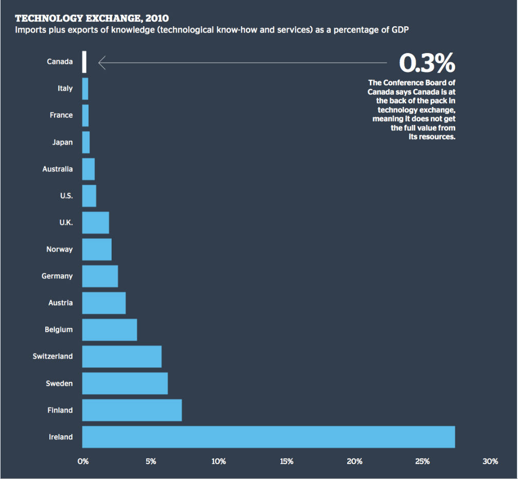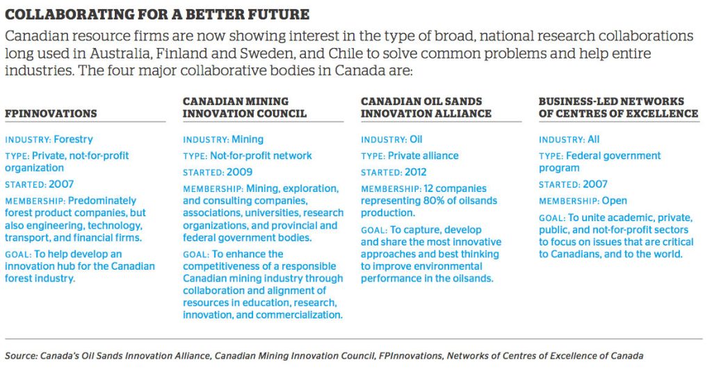 If Canada wants to stop being only a hewer of wood and drawer of water and add, extract, or build more value around its natural resources, it must do a better job of collaborative research involving government, academe, and industry. To do this, federal and provincial governments must concentrate their funding for research and development on collaborative projects between groups of companies and academic institutions, borrowing the best ideas from existing models in Australia, Finland, and Chile, among others. Small-scale efforts such as the Centre for Mining Innovation in Canada, FPInnovations, and the Canadian Oil Sands Innovation Alliance provide templates for broader, national efforts.