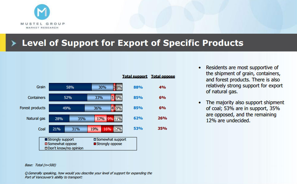 Research conducted by the Mustel Group and highlighted recently in The Vancouver Sun found that a solid majority of Vancouver residents understand the importance of the city’s port to the British Columbia economy and a significant majority also support the export of all major categories of the province’s resource exports, from grain to forest products to natural gas and, yes, coal.