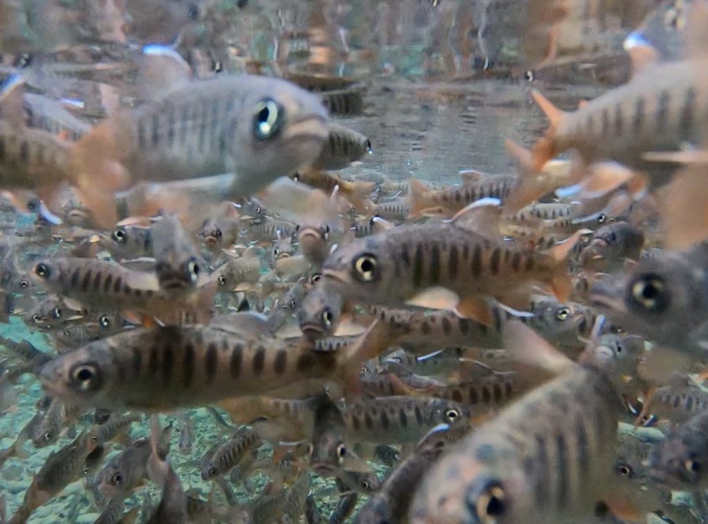 Hatchery coho at the Oyster River Hatchery, a program supported by the salmon farm industry. They will be released into the wild, reviving a river system where, before the advent of salmon farming, wild salmon had become almost extinct.