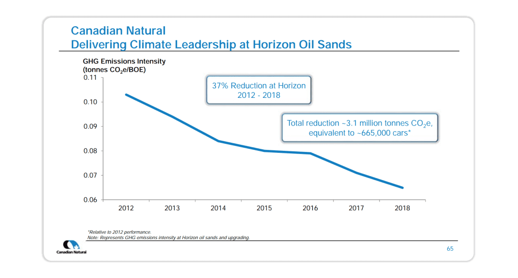 Steve: Yeah, I know I think it’s like you say, it’s a legacy perception. Capital cost to bring on oil sands is high up front. But once you’re on, say the mining at Horizon or at Albian, you have like 50, 60 years of no decline in production. It’s essentially a manufacturing operation. And you’re able to use all kinds of continuous improvement techniques, you’re able to leverage technology, you’re able to do innovation because you got that massive reserve base behind you that you know is there every day, there’s no declines, there’s no risk. So you’re really focusing on how to be effective and efficient and drive down not only your costs, but drive down your emissions, and we can talk about that here.