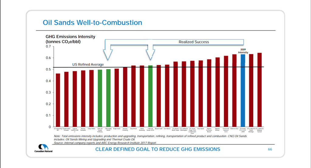 Jackie: Maybe we should talk a little bit about greenhouse gas emissions, because another perception is that oil sands are some of the highest GHG intensity crudes in the world, but that’s changing too. I’m going to highlight a recent presentation that shows your oil sands’ well-to-combustion emissions relative to other crudes around the world, and you’re showing that your operations are actually close to the average of crude oil that’s consumed in the United States right now, not actually the high emissions that oil sands is perceived to have.