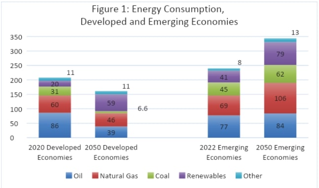 As we saw in the previous article in this series, developing nations face the dual challenge of phasing out GHG-emitting fossil-fuel power generation while simultaneously building out new power sources to meet increasing demand. Figure 1 shows under current trajectories, despite almost doubling its renewables capacity, fossil fuel energy generation, notably coal and natural gas, are still forecast to grow.