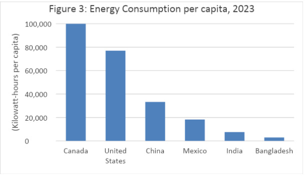 The inequality in energy consumption between nations further complicates this picture. The differences are obvious. Figure 3 shows energy consumption per person in a developed country like Canada, versus consumption in less developed countries. While the average Canadian consumed about 100,000 kWh of energy in 2023, the average person in Bangladesh used less than 3,000 kWh. These differences directly translate to disparities in living standards and economic opportunities.