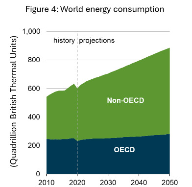 Developed nations face a similar, though less pronounced, challenge. They too must replace existing coal- fuelled power with renewable sources while also investing in new green energy sources to manage growing demand. However, developed nations have more diversified energy sources, such as solar, wind, nuclear, and hydro. Their future energy needs are modest compared to developing nations, largely due to slower economic growth rates. Developed nations also have the financial and technical resources to make the necessary investments in cleaner power sources. Figure 4 shows a flat or slightly increasing forecast for energy demand among OECD countries, driven by minimal population growth and modest economic expansion, which is offset by improvements in energy efficiency.