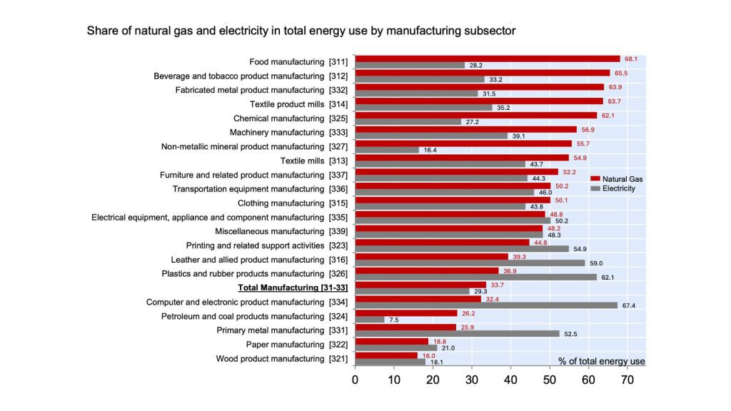 - As in other countries, manufacturing in Canada is highly energy-intensive, drawing nearly 34% of its energy from natural gas and 29% from electricity.